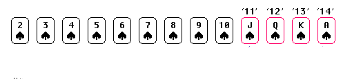 If you start with the two and work upwards, the ace becomes the "fourteenth" card in the suit as shown on the diagram above. Assuming you have the opening lead, the correct card to lead is the fourth down from the top of the suit. For example if you hold the cards shown here you would lead the ten of